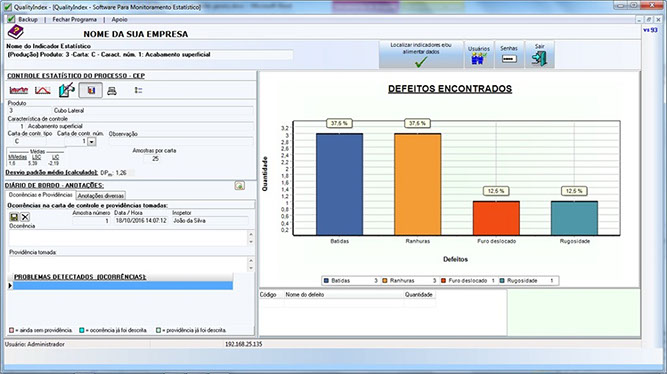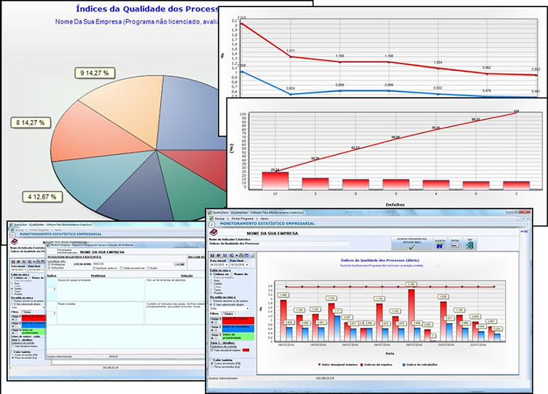 - Geração instantânea de indicadores gráficos de barras, pizza, linha e Pareto;