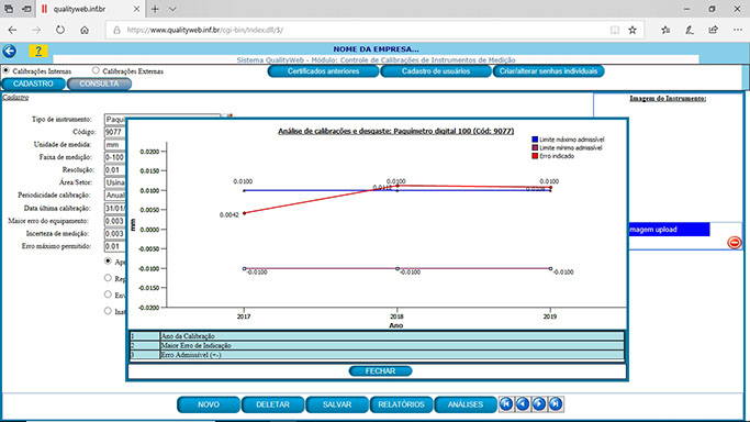 - Exibe análise gráfica dos resultados das calibrações sofridas, permitindo uma avaliação do desgaste e previsão da vida útil de cada instrumento;
