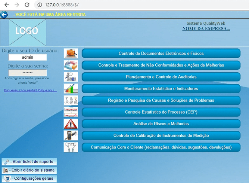 O acesso à área restrita é feito na tela inicial do sistema, onde o usuário digita o login e a senha da empresa para obter acesso à área restrita da empresa. Na área restrita, o usuário pode efetuar o seu login individual para poder acessar os módulos onde estiver cadastrado. Esse cadastramento de usuários é feito pelo administrador, que é um funcionário da empresa que contrata o programa. Veja abaixo como é a área restrita de uma empresa.